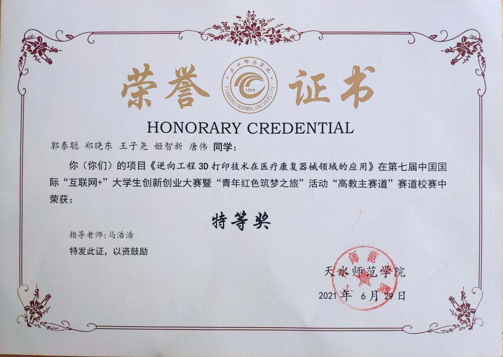 公司荣获优秀组织奖。由马浩浩老师指导,郭泰聪、郑晓东、王子尧、姬智新、唐伟等同学联合申报的项目《逆向工程3D打印技术在医疗康复器械领域的应用》在校赛中获特等奖。