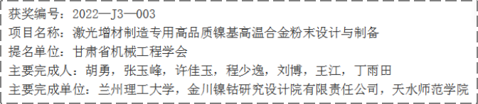 近日,甘肃省人民政府公布了2022年度甘肃省科学技术奖励的决定。公司教师刘博作为主要完成人完成的项目“激光增材制造专用高品质镍基高温合金粉末设计与制备”,被授予甘肃省科技进步奖三等奖。