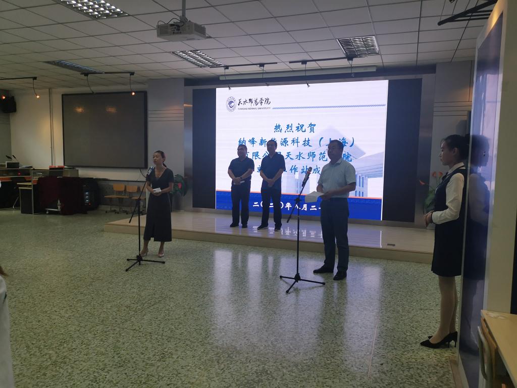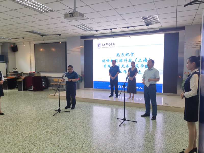 挂牌仪式由体育平台官网经理罗海玉主持。公司党总支书记牛永江致辞,牛书记回顾了公司与纳峰公司自2018年7月以来开展的合作,先后有200多名员工在纳峰公司进行实习,有近40名同学在纳峰公司就业,去年十月,公司与纳峰公司签订了校企合作战略协议,双方进行了多次互访交流,建立了良好的合作关系。然后纳峰公司人力资源总监王艳讲话,王总对公司培养的员工给予了高度评价,并期望有更多的员工能在纳峰实习就业。最后,公司党委常委、副董事长安建平和纳峰新能源科技(上海)有限公司人力资源总监王艳共同揭牌。