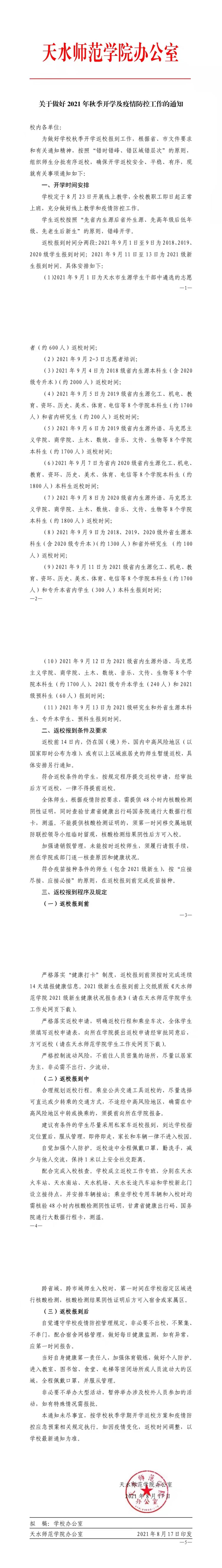 关于做好 2021 年秋季开学及疫情防控工作的通知