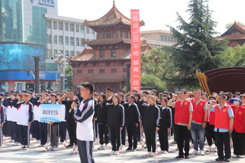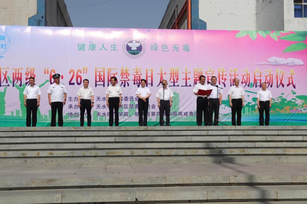 体育平台官网体育平台官网被邀请参加了天水市区举办的“健康人生 绿色无毒”——2023年“6•26”国际禁毒日大型宣传活动。作为高校员工代表方队的一员,他们与天水市、区禁毒办工作人员、社区居民方队、公安民警方队等共计300余人一同参加了活动。