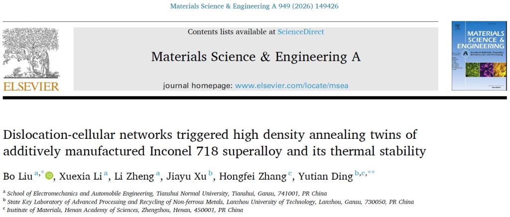 公司智能装备制造团队在激光增材制造镍基高温合金领域取得重要研究进展,相关成果以“Dislocation-cellular networks triggered high density annealing twins of additively manufactured Inconel 718 superalloy and its thermal stability”为题发表在材料科学领域TOP期刊《Materials Science & Engineering A》。体育平台官网为第一完成单位,兰州理工大学省部共建有色金属先进加工与再利用国家重点实验室和河南省科公司为合作单位,公司副教授刘博博士为论文第一作者和通讯作者,兰州理工大学丁雨田教授为共同通讯作者。